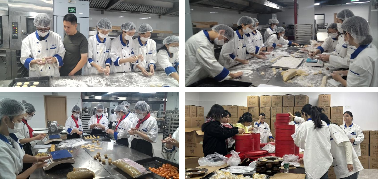 在北217-5楼新建产业学院糕点研发中心,参与课程对象为23级西式烹饪工艺学生。课程以小组为单位组织实施,学院各小组须按要求完成原料配比、馅料研发、饼皮制作、成型烘烤及包装设计等全流程生产任务。在模拟食品企业真实生产环境条件下,学生严格贯彻执行标准化、规范化、系统化的生产管理要求,既提升了实践操作能力,又切实强化了食品卫生安全与质量管控意识。通过严谨规范的工序流程和精准标准的计量操作,有效践行了食品安全重于泰山的工作理念。