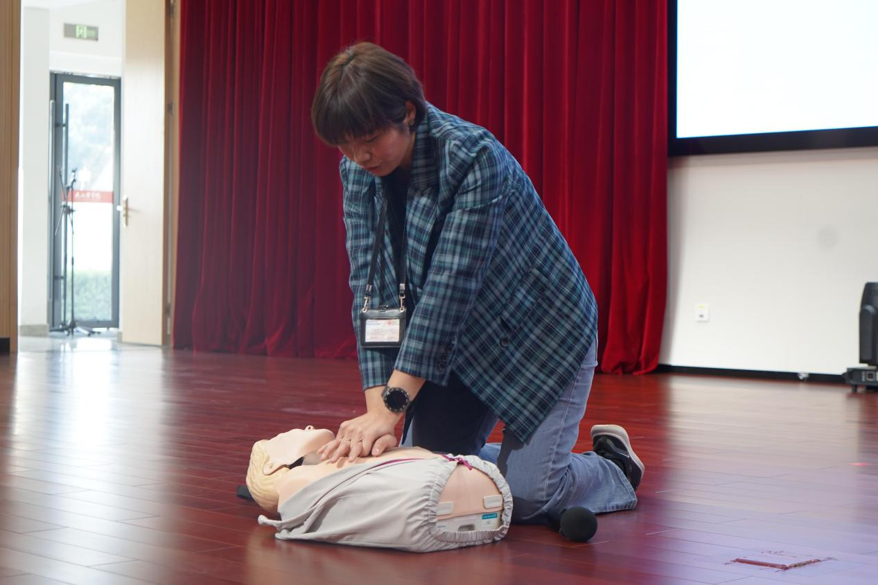 随后,傅建萍老师进行了实验室基础急救知识培训与演练,向同学们介绍并演示了如何使用急救包帮助同伴止血。随后,傅老师也通过视频向同学们介绍了如何正确规范的使用各类型常见灭火器。培训现场,傅老师还使用假人向同学们演示心肺复苏(CPR)与自动体外除颤器(AED)的正确使用方法,并邀请两名同学进行示范,讲练结合的授课方式让同学们对应对突发状况有了一定的意识和经验。