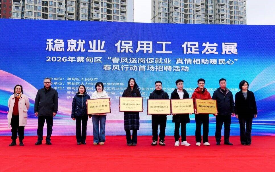 227日上午,由蔡甸区人民政府主办,蔡甸区人力资源和社会保障局承办,蔡甸区财政局、蔡甸区农业农村局、蔡甸区经济信息化和科技创新局、蔡甸区文化和旅游局等单位共同协办的“春风行动”专场活动在蔡甸广场举行。活动聚焦青年创业培育,为辖区内优秀大学生创业主体授牌,威廉希尔学生蒋延作为大学生创业代表受邀参与授牌仪式,以专业的创业实践与亮眼的项目成果,展现了学院学子深耕专业、勇于创新的青春风采。